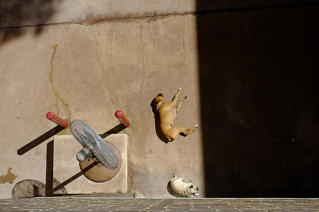 Photographer F1.2 found an interesting angle and perspective on one of our favorite subjects, animals. The lines of the shadows add great compositional interest the photograph, while the juxtaposition of the large dog napping while the little dog keeps guard is quite funny.