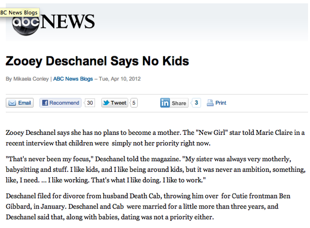 Someone at ABC News might want to bone up on their knowledge of whimpering indie pop. Or maybe just suffer through an episode of the loathsome Fox sitcom The New Girl. On Tuesday, in an attempted reading of a Marie Claire interview with manic pixie dream girl Zooey Deschanel, ABC News made the annoyingly spacey actress’ personal life way more interesting than it actually is.
