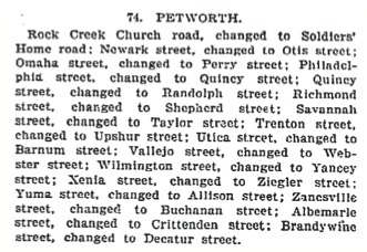An announcement of new street names in Petworth appeared in The Washington Post in 1901.An interesting history of the Crestwood neighborhood included the following explanation as to how the new names were assigned:
