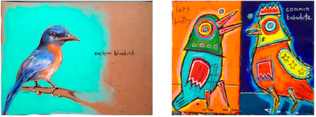 “Bluebird” by Dana Ellyn, 9″x12″, acrylic on canvas; “Lark Bunting and Common Bobwhite” by Matt Sesow, 16″x20″, mixed media on canvas