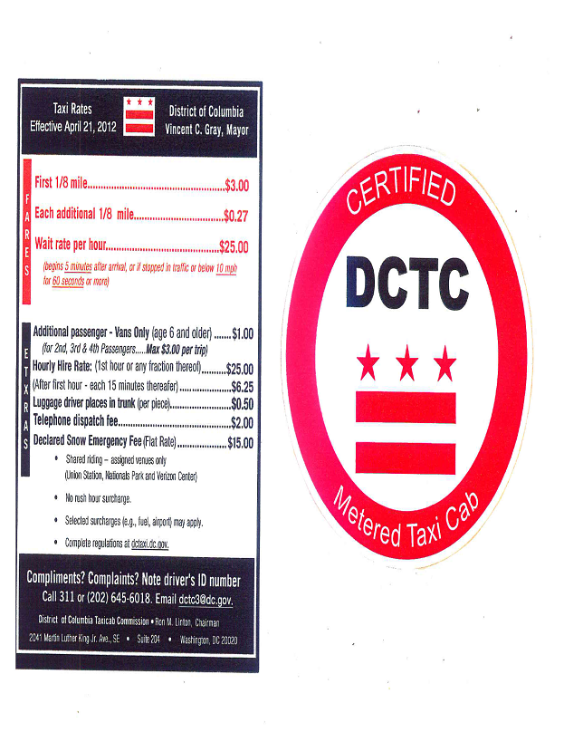 So how do you know that your cab is charging the new or old rates? According to the D.C. Taxicab Commission, just look for the red-circled sticker below for cabs charging new rates. Cabs still charging the old rates have a similar sticker, though it’s blue.