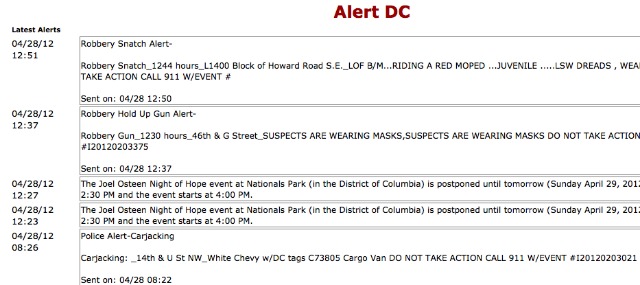 The city’s text and email-based alert system is helpful when knowing that a certain type of crime happened in your neighborhood, there’s a massive traffic jam or Joel Osteen’s “Night of Hope” at Nationals Park is postponed until tomorrow. Wait, what?