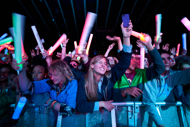 Earlier, pop-rockers fun. kicked off the proceedings on the main stage, warming up the crowd with a cloying performance that (of course) pivoted around their ubiquitous anthem “We Are Young,” the early 21st century’s unfortunate antithesis to “Smells Like Teen Spirit.” Highly-touted hip-hop upstart A$AP Rocky took the stage half an hour late before delivering an abbreviated four-song salvo, while Fitz and The Tantrums gamely showcased their crowd-pleasing soul revivalism, adding a cover of The Eurythmics’ 1983 hit “Sweet Dreams (Are Made of This).”