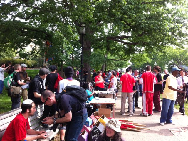 It was a lovely, slightly humid, afternoon to spend in Meridian Hill Park. About 3:30, members of Occupy D.C. started filling the hilltop park with signs, bicycles and other demonstration materials. A small stage was erected; a sound system played The Supremes’ “Baby Love,” Smokey Robinson’s “Tears of a Clown” and other soulful hits of the ’60s and ’70s.
