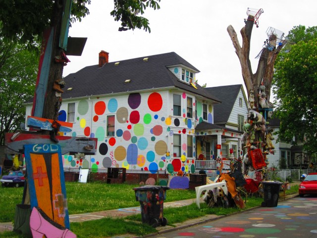 Detroit looks exactly how people have told me it does: like a former warzone. Houses, hotels, office buildings and factories have been abandoned or burned down with visible broken windows patched with plywood, exposed beams and scattered piles of rubble and human belongings. It’s spread throughout the city amid the still functional homes and businesses. “You can see straight through that huge building!” Chris said. It was indeed remarkable and yes, quite sad, but we were soon inspired by our visit to the 3600 block of Heidelberg Street. The Heidelberg Project has transformed abandoned properties in an east Detroit neighborhood into colorful and provocative works of art that are more than a little disturbing. The crucified stuffed animals were particularly creepy, but overall, the block felt invigorated and positive, and it was nice to see some of the residents hanging out and playing happily while tourists like us walked around and snapped photos.