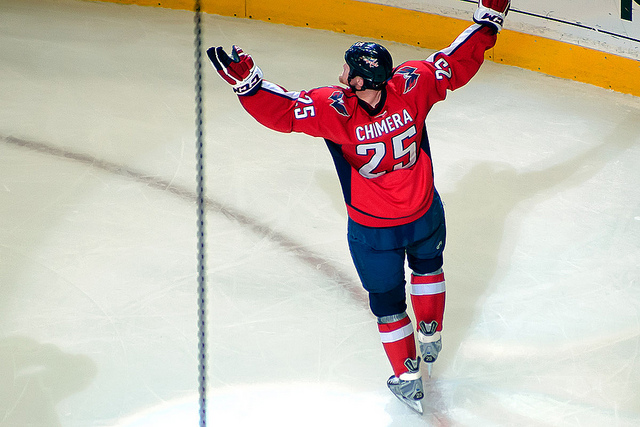 Jason Chimera celebrates after scoring his second-period goal last night in Game 6 of the Eastern Conference semifinals. (Photo by Clydeorama)