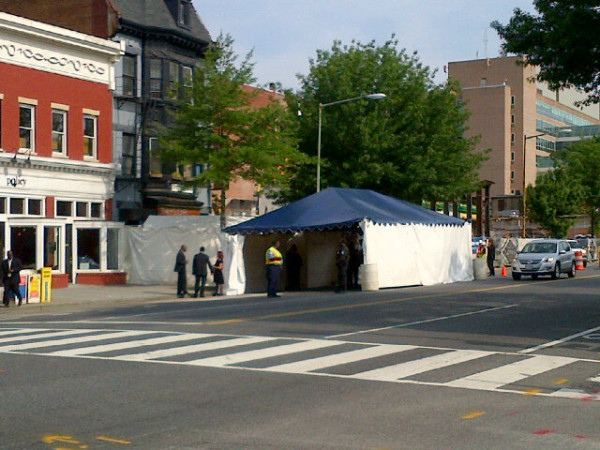 We saw the above photo on the Prince of Petworth’s site, with Dan Silverman wondering what or who necessitated the forbidding tent that appeared this morning outside the Taylor Gourmet sandwich shop at 14th and T streets NW.