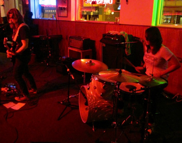 Happy Dog is awesome. It sells vegan and meaty dogs as well as fries and tots, and there are 50 toppings to choose from. Also, one never has to wait long for a drink, as the large, circular bar is always adequately populated with friendly, speedy bar staff. Heather played in both of the opening acts. First was Gypsy Spit with Heather on vocals and guitar and Lisa on drums. They only had a few songs but they blew us away. Keep your eyes and ears open for more from that duo. Next was Hard Drip, with Heather on bass and our friend Roseanna on drums. They covered “Helter Skelter” and introduced it by saying, “This is a Mötley Crüe cover.” The singer also said at one point, “We’re emotional ’90s indie rockers.” Needless to say, I enjoyed their set thoroughly. We went on third and played a solid final set of the tour to a receptive, boisterous crowd. Field Trip closed the night out with a lovely series of fuzzy, melodic noise-pop songs.