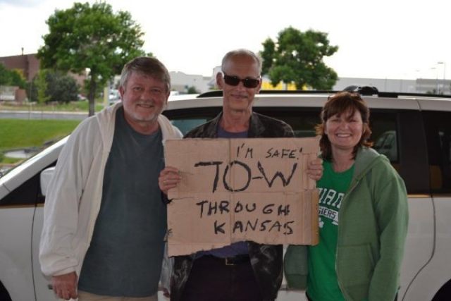 Waters told the couple that he’s “preparing to write a book about his adventures of hitchhiking across America. We’ll have to see how he viewed us. I laughed and said, ‘do you think you just got the most boring people to pick you up at almost the end of your ride’. He said ‘no, no, you’re very interesting’ and said he enjoyed his time with us.” He also treated them to lunch and let them help him find a piece of cardboard for his next sign.