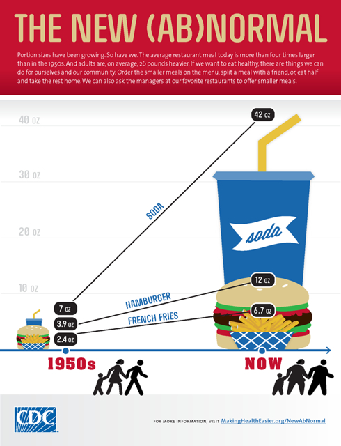 Over the past sixty years, the hamburgers, soft drinks and bags of french fries served up by fast-food restaurants have grown many times over, according to data collected by the CDC. And as a very obvious result, our waistlines are expanding, too.
