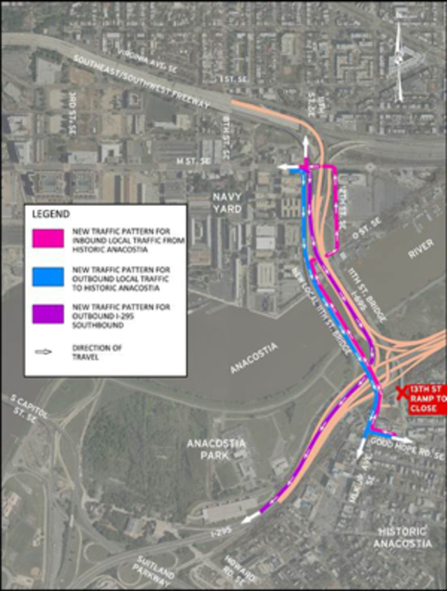 - Protected Crossing: pedestrians crossing to either side of the Anacostia River will be protected from traffic by a concrete jersey barrier wall until the local bridge can be completed this fall.
