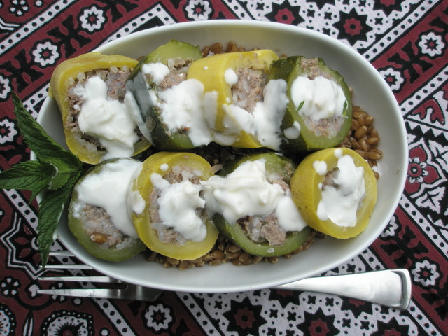 Ciezadlo’s description of her Lebanese mother-in-law’s zucchini dolma, stuffed with ground lamb, cinnamon, and allspice and drizzled with tangy garlic-yogurt sauce, echoed on my tongue when I encountered zucchini at the farmers’ market last week. For the first time, I bought some. I took them home and set to boring out their centers with an apple corer (bereft of the utensil that Middle Eastern cooks have devised for accomplishing this very task). I packed the filling into the hollow cavities as if stuffing a sausage, “corked” the holes with the zucchini stems turned inward, and steamed them whole in a simmering pot of beef stock and butter.