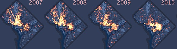 Friend of DCist Michael Jantzen dipped into the city’s bike theft statistics from 2007 to 2010 and found that close to 2,500 bikes were reported stolen in that period. Additionally, he discovered—and mapped—the fact that the majority of bike thefts migrated from parts of Northwest to Capitol Hill over those years.
