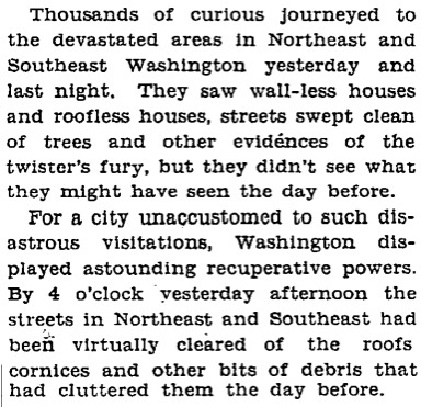 The last big tornado to hit the region was in 2001, when a twister touched down in College Park and tore across the University of Maryland campus, killing two. One of the bigger tornadoes to hit D.C. came in 1927, when a twister struck parts of Capitol Hill, destroying some 372 homes and leaving one person dead. The city was quick to respond, though, as evidenced by a Post article on the storm: