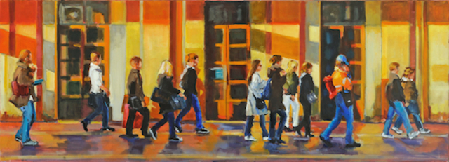 Platform Walkers, Stazione Di Lucca, Italy by Shelley Lowenstein, oil on canvas, 16” x 44”