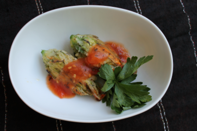 6. Drizzle the tomato sauce over the blossoms and garnish with fresh herbs if desired.