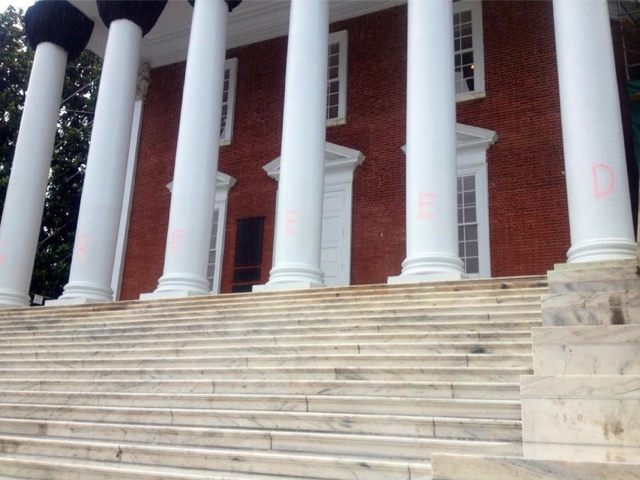 The letters in the photo above are faint, but spelled out in red on the pillars on the portico of Thomas Jefferson’s Rotunda is the word “greed.” The statement could be a reference to University Rector Helen E. Dragas, the head of the school’s Board of Visitors, who told Sullivan that she had enough votes on the 16-member panel to call for Sullivan’s dismissal, though an actual vote was never taken.