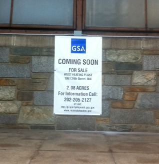 A new for sale sign outside Georgetown’s West Heating Plant.It was left to Flavio Peres, the deputy assistant commissioner for Real Estate Utilization and Disposal at GSA, to explain the delays, and he did the best he could given a hostile panel of questioners. He said that President Obama has ordered that the federal government slim down on its holdings, and that it was committed to doing so.
