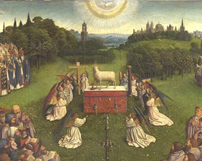 Detail from Jan van Eyck, The Adoration of the Mysitcal LambYour RV work, as well as your series of mannequins in Africa and the Middle East seem to comment on man vs. nature in a specifically commercial aspect.