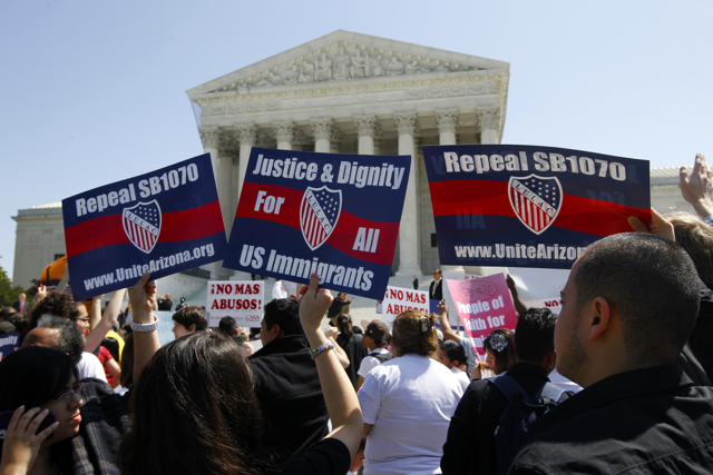 Opponents of Arizona’s controversial immigration law outside the Supreme Court during arguments in April. (AP Photo/Charles Dharapak)