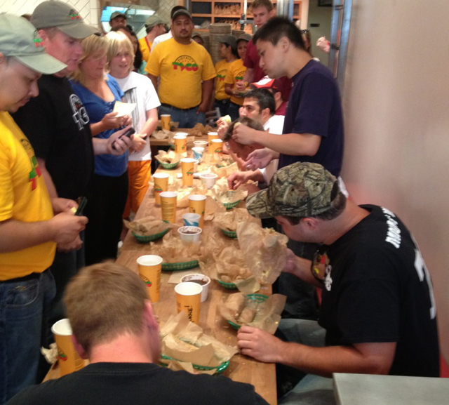 “It’s really tough. I’ve seen some big guys try this contest and not (get) even close,” says [District Taco owner] Marc Wallace. “They get to eight and they’re tapping out, sweating and practically crying.”