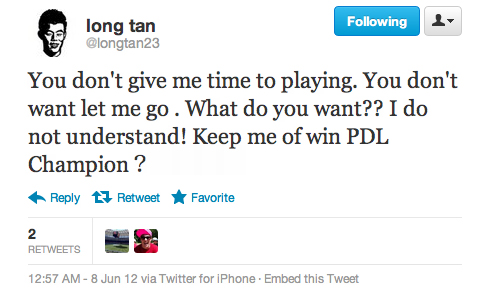 Where Tan has really made waves this year is on Twitter. Clearly dissatisfied with his playing time, Long did what any seasoned athlete does these days—filed his grievance in 140 characters or fewer: