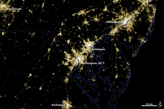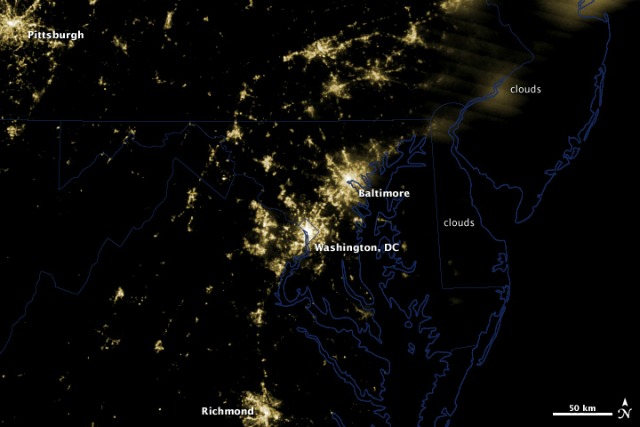 Last week’s derecho storm knocked over trees and power lines, leaving millions of residents in the region without power. And while the numbers and the stories of homes left powerless for days certainly help us appreciate how violent a storm it was, the two following images taken by NASA’s Earth Observatory—one before the storm, one after—give a much better sense of how extensive the power outages were.