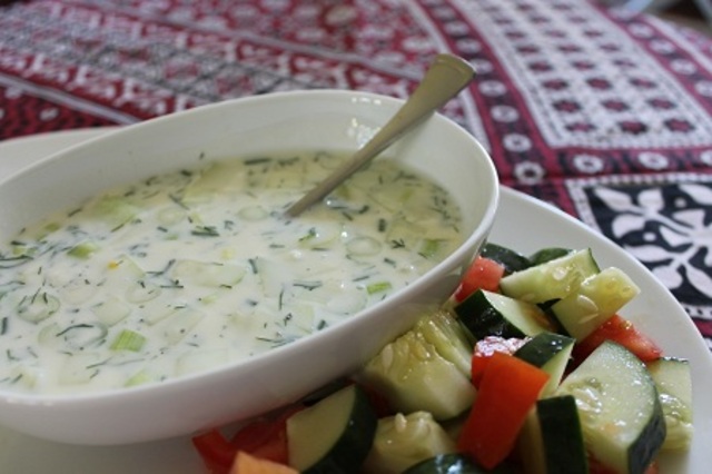 The soup’s name comes from the Russian word kroshit, meaning “to chop finely,” which is what you’ll be doing to the vegetables that go into it. Russian dishes gained popularity throughout the Soviet Union while it existed, and this one can be found on summer menus across the former USSR. Often, a tangy beverage called kvas made from fermented rye bread is used for the broth instead of yogurt, but this creamy version is more popular in the ‘Stans, where fermented milk products have long formed a cornerstone of the local diet. It’s a light and refreshing antidote to the oppressive summer heat, no matter what hemisphere you’re in.