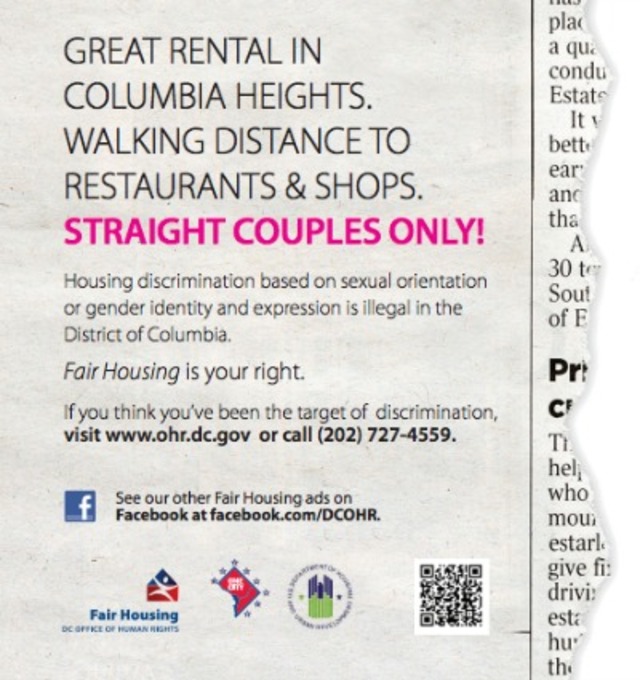 Appearing in eight D.C. newspapers, the ad campaign stresses that being denied housing on the basis of any of 19 protected characteristics—from race and religion to sexual orientation and gender identification—is illegal and can be reported to the Office of Human Rights, the agency charged with enforcing the 1977 D.C. Human Rights Act.