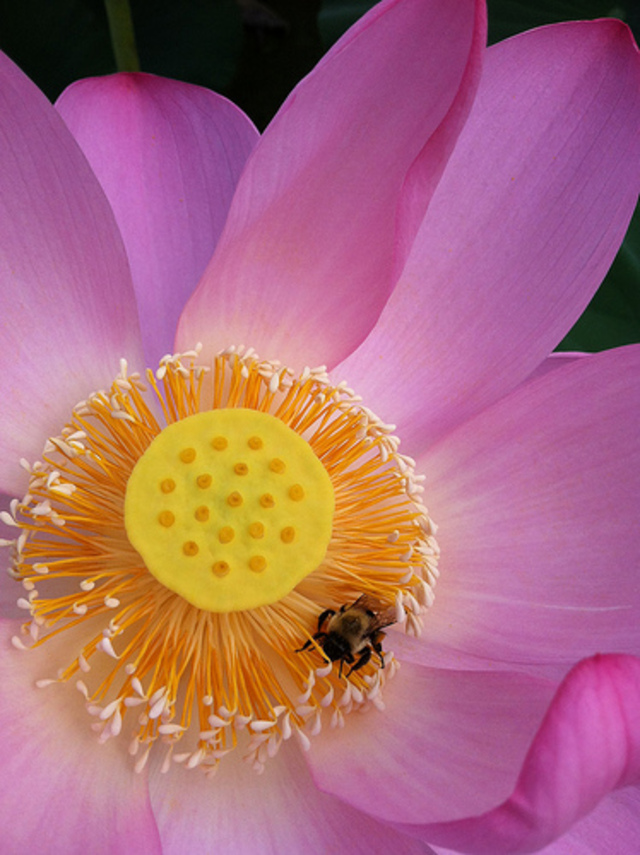 The lotus flowers are coming! The Kenilworth Park and Aquatic Gardens’s Water Flower Festival is next weekend. A. Drauglis Furnituremaker gives us a sneak peak, capturing a dramatic flowery scene with the bright colors of the lotus and the little dark-hued bumblebee.