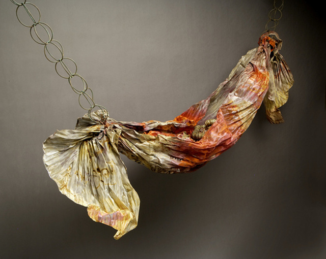 Hush, Becki Banet Lucas, Indianapolis, Indiana, sculptured copper textile, 76 x 24 x 30 inches, photograph by Addison Doty, courtesy The Cradle Project and Firelight Foundation.>> See Polish crochet artist Olek, known for her handiwork clothing the Wall Street bull, in action as she designs new duds for the Albert Einstein Memorial today from 4:30 to 6 p.m. Olek is one of the artists featured in Smithsonian American Art Museums’ exhibition 40 under 40: Craft Futures, opening on Friday at the Renwick Gallery.
