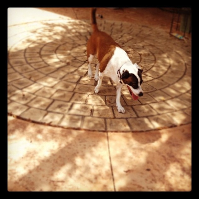 The off-center composition of this puppy in the shade gives Ela room to move, but I hope the unshaded sidewalk isn’t too hot for her paws. Lauren Woeber composed.
