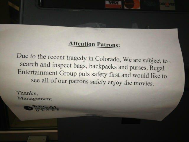 In the wake of yesterday’s shooting in Colorado at the premiere of The Dark Knight Rises, D.C. police announced that they would be monitoring screenings of the movie in the city. Additionally, the Regal Gallery Place theater posted an announcement saying that it reserved the right to search moviegoers’ bags, saying that it “puts safety first and would like to see all our patrons safely enjoy the movies.”