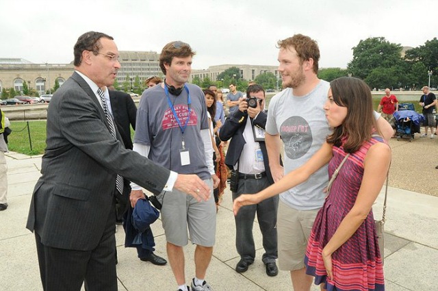Last week, NBC’s Parks and Recreation filmed a Season 5 show in D.C., using both the White House and U.S. Capitol as backdrops. Mayor Vince Gray stopped in on Friday afternoon, where he chatted with cast members Aubrey Plaza (who plays April) and Chris Pratt (who plays Andy). Aren’t you curious what Gray may have said to them?
