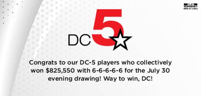 Then again, what are the odds of this happening? Well, that’s easy. D.C.-5 picks five numbers between 0 and 9 without restricting the same number from being drawn multiple times, so it’s just some simple arithmetic: 10^5=100,000. With two drawings a day, a result of 6-6-6-6-6—or any combination for that matter—should occur about once every 137 years. So if we get the same winning numbers any time before July 2149, then you can panic.