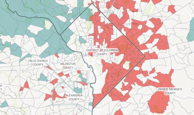 As for Washington, in 2010 31 percent of low-income households were in low-income tracts, putting us seventh among the top 10 metropolitan areas in the country. (New York led the charge with 41 percent, Atlanta stood last at 26 percent.) As for upper-income households, 15 percent were in upper-income tracts, again putting us in seventh place. (Here Houston led with 24 percent, while Boston only came in at eight percent.)