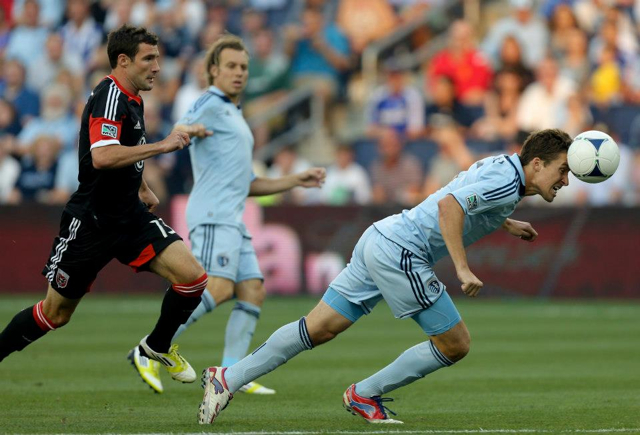 Kansas City’s Matt Besler heads the ball toward the goal as United forward Chris Pontius chases. (Ed Zurga/Getty Images via Sporting Kansas City)