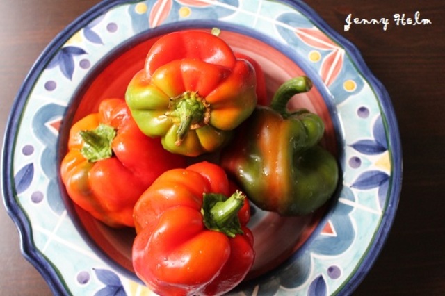 Peppers caught my eye at the market this week, their skins like a blazing vegetable sunset turning from deep green to burnished red. As a child I loved them best raw, the cool, juicy snap of them. Lately though, I’ve started roasting them more and more often.