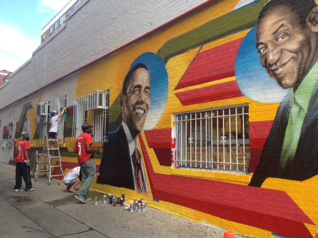 Aniekan Udofia and his apprentices are the artists behind this project. According to Murals DC, a city-wide initiative that aims to combat illegal tagging graffiti, Udofia started outlining the mural late Wednesday night. This afternoon, the faces nearest to U Street — Obama and Cosby (the two customers who can eat for free at the Chili Bowl) — look to be complete. The website also says that Udofia hopes to be finished by next Tuesday, August 28.