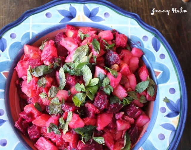 3. Mix the salad: On the day you plan to serve the salad, peel the roasted beets and sweet potatoes and chop them into ½-inch chunks. Chop the apples into ½-inch chunks. (Peel if you like: I don’t.) Mix the beets, sweet potatoes, apples, dried fruit, and nuts in a large bowl and pour the dressing over them, stirring well to combine.