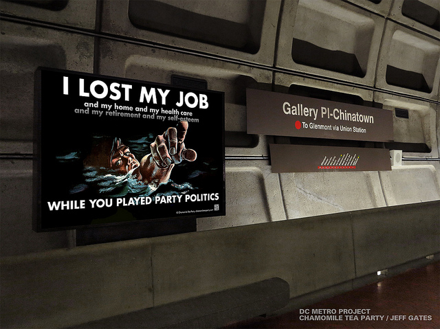 The first poster appeared in the Gallery Place station at the start of September and will remain through the end of the month. It features an image of a man drowning while pointing his finger towards the viewer. A message on the ad reads, “I lost my job and my home and my health care and my retirement and my self-esteem while you played party politics.”