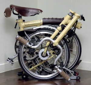 A Brompton folding bike, fully folded.It’s commonly known that bringing a bike on Metro during rush hour isn’t permitted, but how about folding bikes? Well, as the City Paper reported in July, the director of the D.C. Office of Planning was told that her folding bike had to be carried in a bag or not brought into the transit system at all. Today, though, Metro announced a change to that policy: