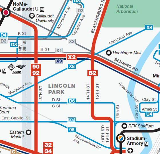 Metro’s bus maps are already brightly colored and relatively accurate to local geography. (One need only look at the maps published by New York’s Metropolitan Transit Authority, with Manhattan expanded to ridiculous proportions, to see how easily a transit system can err in its cartography.) But the Washington Area Metropolitan Transit Authority still has ways to improve on the maps that adorn its bus shelters.