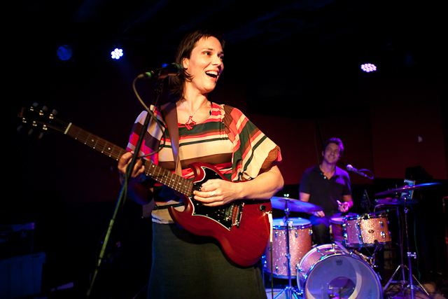In addition to eight songs from Silencio and one from her 2010 solo debut, The Trip, Sadier also played several songs by her former band Monade, which started as a Stereolab side-project before developing into an excellent band in its own right. “Wash and Dance” (from the 2005 LP A Few Steps More) was particularly stellar, arguably the evening’s best song and probably the one that got the most spirited audience response, at least until the encore. Sadier delivered stirring vocal melodies, singing in French, and although the recorded version’s spiraling keyboard lines were definitely missed (Monade was a four-piece), the song built up irresistible, almost danceable momentum, propelled by James Elkington’s samba-inflected beats, Julian Gasc’s pulsing bass line, and Sadier’s percussive guitar chords.