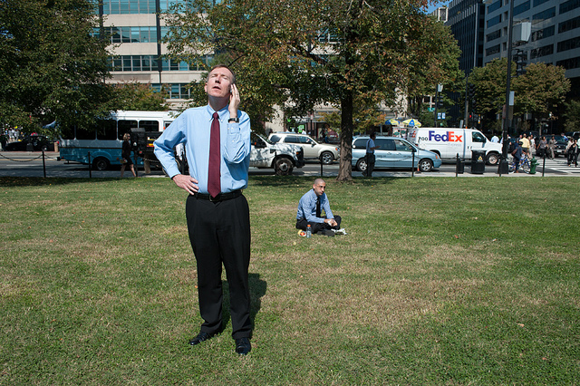 Flickr contributor yospyn faithfully captures what could be any of us: seeking to enjoy the pleasant fall weather but not wanting to step away from work, this D.C. officegoer splits the difference. His workaholic habits only seem more extreme when contrasted against the man behind him, who is quietly enjoying his lunch.
