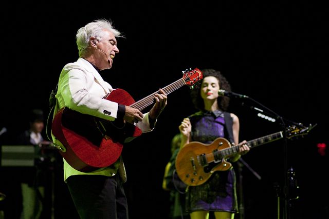 Along with all but one of the twelve tracks on Love This Giant, Byrne and Clark also played a selection of songs from their own oeuvres, and these often got the most spirited response from the audience. Byrne, of course, remains best known as the frontman for Talking Heads, and he led his cohorts through a few of the celebrated new-wave band’s popular favorites, starting with the jaunty “This Must Be the Place (Naïve Melody),” which he sang while engaging in a series of on-stage calisthenics so spectacularly awkward that they actually became mesmerizing. On his catchy 2001 solo track, “Like Humans Do,” Byrne traded vocal melodies and dance moves with Clark, the pair grinning broadly as they shimmied about the stage, and “Strange Overtones” (a 2008 collaboration with Brian Eno) provided a sparkling early-set highlight.