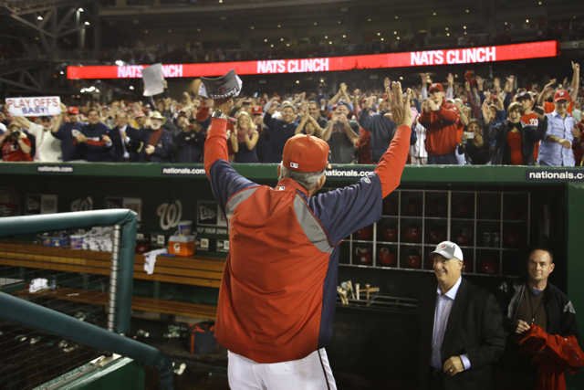 Nationals manager Davey Johnson waves to the crowd at Nationals Park after clinching a playoff spot. (AP Photo/Jacquelyn Martin)