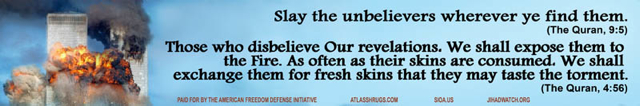 Well, Geller is none too impressed with CAIR’s 16-foot banners that are going up this week at the Glenmont, Georgia Avenue-Petworth and U Street Metro stations. So the American Freedom Defense Initiative’s next round of advertisements are going to go much harder than the black background with red, white and blue text. How?