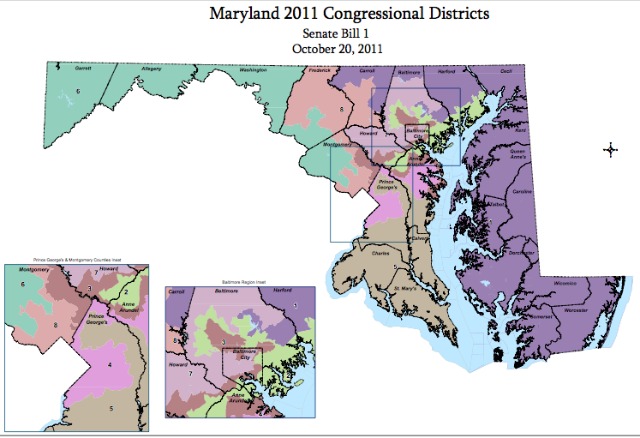 Maryland’s map is the product of 2011 redistricting in which Democrats were accused of gerrymandering districts so as to protect incumbent Democratic legislators and oust Republicans. Gov. Martin O’Malley has defended the map, saying that most residents stayed in their districts and that compact districts are hard to come by in a state like Maryland.