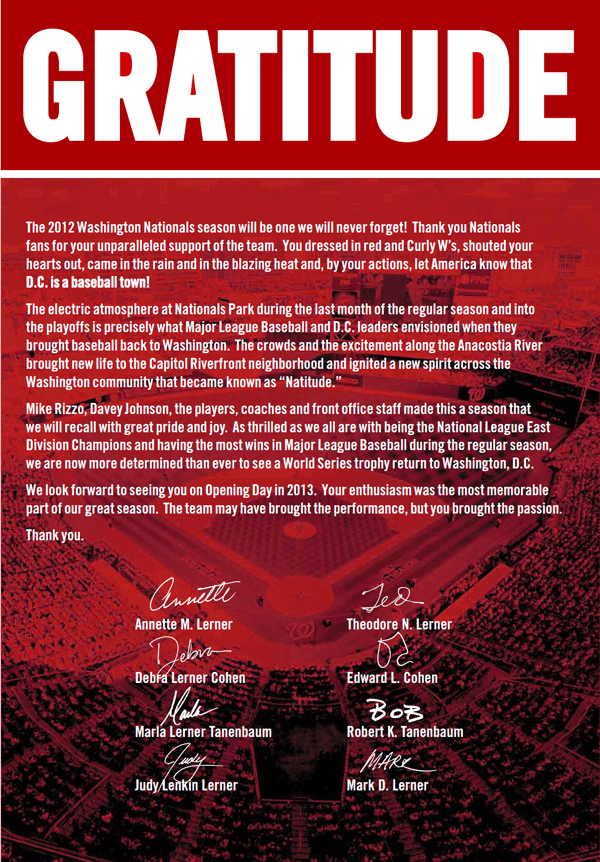 Readers of today’s dead-tree edition of The Washington Post opened today’s Sports section to find a full-page advertisement paid for by the Washington Nationals. The ad, headlined “Gratitude,” is in the form of an open letter from members of the Lerner family. (It was also sent as an email to season ticket-holders and members of the team’s fan club.)